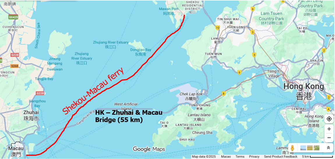 Macaohon pääsee Hong Kongista maailman pisintä (55 km) merisiltaa pitkin, mutta Shenzhenistä kätevin tapa on silti lauttayhteys. Ensin metrolla Shekou-satamaan (1:20), josta lautalla (1:00) Macao Taipa -satamaan.