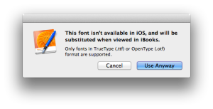 Custom fonts: iBooks Author can embed any TrueType or OpenType font (those with a .ttf or .otf extension) into any book that you choose, and the process is as simple as opening the Font Picker or the Text Inspector and selecting one. If you choose a font that doesn’t have a TrueType or OpenType version, you’ll get an error message informing you that, if you use the font, one of the iPad’s system fonts will automatically be substituted for it.