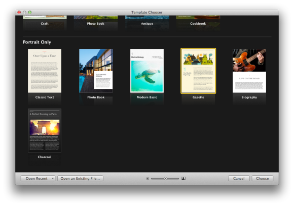 In addition to the three new landscape templates, iBooks Author introduces portrait-only templates, which seem to be aimed toward Apple’s new iPad mini. Most of the new portrait-only templates skew away from the textbook design, instead targeting specific reading genres: Biography and Photo Book offer basic designs for those book types, while Gazette, Classic Text, and Charcoal take their cues from storybooks and picture books. Modern Basic is the lone new textbook-style template, and even it leans more toward minimalistic how-to than full-fledged instructional manual. In total, the program offers nine new templates (though you can always purchase additional templates from non-Apple vendors or create your own in-program).