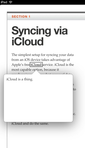 That said, if Apple's concern involves disappointing customers with small text, I'm confused as to why it allows publishers to sell iPhone versions of non-iBooks Author fixed-format ebooks on the iBookstore, rather than disallow anything but flowing text on its smallest devices. As it stands, iBooks Author is a segmented product—one that can only serve half of the iOS devices Apple makes—and that keeps it from being a truly compelling tool for the majority of iBookstore publishers.